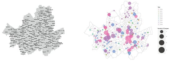 There are 24 autonomous “gu” districts in Seoul, divided into 424 administrative “dong” sub-units in Seoul. The 424 administrative “dong” is plotted in the left panel of Figure 2. Then, to understand the installation status of public quick chargers for EVs in Seoul, installation year and location of public quick EV charging stations using data on public quick chargers from the Public Data Portal (data.go.kr, accessed on 29 June 2020) are plotted in the right panel of Figure 2.