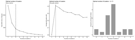 Results for the elbow (left), silhouette (middle), and other 26 criteria (right) as heuristic methods.