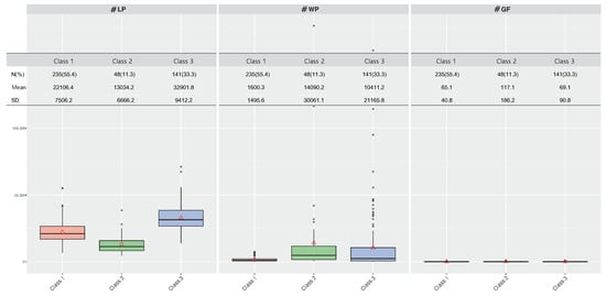 Then, we can naturally judge that the demand for quick charging stations will be high in places where the living population, working population, and guest facility are concentrated. To identify these characteristics of each Class, descriptive statistics and boxplots for 3 classes in each feature are reported in Figure 5, which shows the least frequency with 48 (11.3%) administrative dongs belonging to Class 2, the highest 235 () administrative dongs belonging to Class 1 were found. In addition, the features #WP and #GF have the highest values for both mean and standard deviation (SD) in Class 2, while feature #LP do so in Class 3.