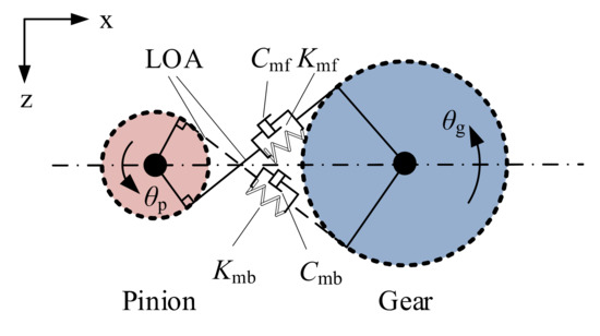 The single−stage spur gear transmission is widely employed in gear transmissions in locomotives [8,9,10,11,12,21,22,27]. The traction torque generated from the traction motor is transmitted to the wheel–rail interface via the flexible teeth deformation of the gear pair along the line of action which is represented by a spring–damper element (Km, Cm). Under the effect of the intensified wheel–rail interactions, especially considering the wheel flat and other defects, the forward− and backward−side contacts may occur.