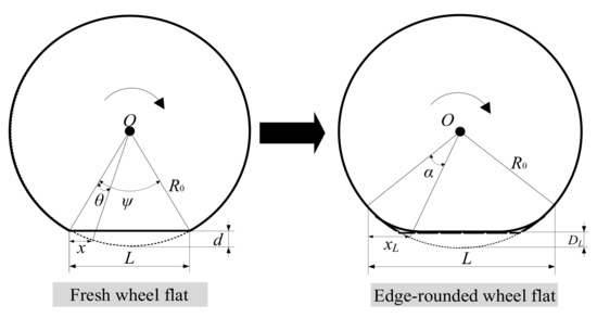 As a common fault of the wheel, a wheel flat can generate a periodic impact at the wheel–rail contact area and significantly intensify the wheel–rail interaction, which is induced by emergency braking or skidding idling. During the operating of a locomotive, the straight edges of the fresh flat are rounded; therefore, it is more rational to analyze the effect of an edge−rounded wheel flat. The evolution process of the wheel flat is shown in Figure 4.