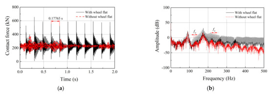Wheel−rail contact forces: (a) time histories and (b) frequency spectrum.