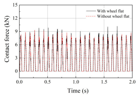 In this study, the time−varying displacement excitation induced by a wheel flat is substituted for the wheel–rail elastic compressive deformation at the contact area. Therefore, based on the Hertz theory, the interactive force between the rail and the wheel with a flat can be calculated by