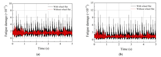 Without loss of generality, the results extracted from the first roller are used to reveal the laws of motion variation representing the results for all rollers. The roller−race contact forces and the corresponding friction forces are shown in Figure 8. Compared with the results with a healthy wheel, the RMS value of the roller−race contact forces slightly increases approximately 0.01 kN. According to Equations (21) and (22), the fatigue damage ratios of the motor bearing calculated by L−P theory and ISO method are displayed in Figure 9a,b. It can be seen that the fatigue damage ratio is markedly elevated when the wheel flat−rail impact occurs, and the corresponding mean value (MV) increase approximately 0.08 × 10−13 and 0.15 × 10−13 for L−P theory and ISO method, respectively. Therefore, the wheel flat can pose a potential risk to the fatigue life of the motor bearings, and it can be predicted that the larger excitation excided by a worse wheel flat will seriously threaten the reliability and safety of bearings.