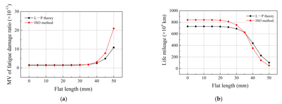 Variations of life mileage of motor bearing versus the flat length: (a) RMS of instantaneous fatigue damage and (b) life mileage of the motor bearing.