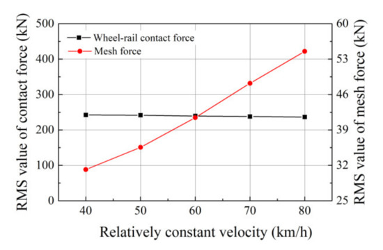 The relatively constant velocity is a major consideration in the operation process of the locomotive, which directly affects the interaction frequency between the wheel flat and rail. In this section, a wheel flat with a length of 30 mm is adopted in simulations under the different traction torques to remains the relatively constant velocity of the locomotive constant at 40, 50, 60, 70, and 80 km/h, respectively. As demonstrated in Figure 13, the RMS value of the wheel–rail contact force remains stable, but the wheel–rail impact frequency is significantly improved as a result of the increase in the rotational velocity of the wheelset. In addition, mesh force increases gradually under the larger traction torque and more high−frequency impact could be observed between the wheel flat and rail. The variations in MV of the fatigue damage ratio and life mileage of the locomotive are displayed in Figure 14. The results denote that the service life of the motor bearing decrease with increased machine velocity owing to the high−frequency wheel flat−rail impact and larger mesh forces. Under the growing traction torques, the negative effect of the wheel flat is aggrandizement as the speed increase. Thus, with the improvement of train speed and trainload, the early diagnosis for the wheel flat can efficiently improve the service life of the locomotive.