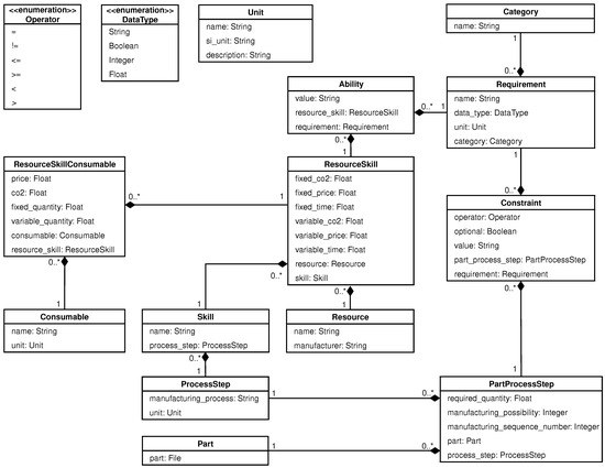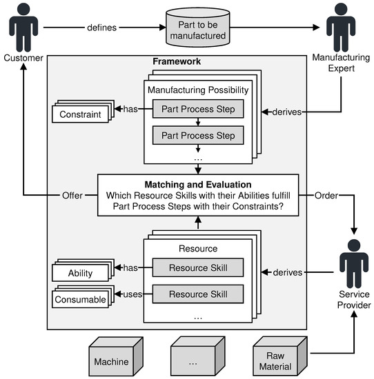 The overall goal of the approach is to identify the combination of resource skills needed to manufacture a part in compliance with defined constraints, which represent the required part quality, while having the best evaluation in price, time, and emission of -equivalents. This requires the matching and evaluation of part definitions in the form of manufacturing possibilities and digitized resources. A skill-based engineering approach [36] is used to describe the resources that have the capability to handle or modify a product, and the product itself (here called part). Resources and parts are the two central models, compiling all relevant information as shown in Figure 1. The part definition and resource information are modeled in a generic way to map all kind of possible characteristics. To do so, an ontology is introduced in Section 3.1. These models are used by service providers to describe available resources (e.g., machines and materials) and resource skills that are linked with the respective resource (e.g., cutting, printing etc.). Resource skills can be enriched with more detailed information about abilities, such as achievable surface roughness (i.e., a metric of quality), and consumables used for the manufacturing process (e.g., coolant). In a next step, a customer wanting to manufacture a part, defines the required process steps in collaboration with a manufacturing expert. Hereby, different manufacturing possibilities can be specified. For example, a part can be milled from solid or first buildup using additive manufacturing technologies and subsequently reworked. Constraints can be added to every part process step to detail the requirements, which must be fulfilled by the corresponding resource skill abilities. It should be noted that in the future these steps could also be performed by volume decomposition and feature extraction algorithms [37] to automatically identify possible process steps. After the definition phase, a fully automated matching (Section 3.2) and evaluation (Section 3.3) is performed by the framework.