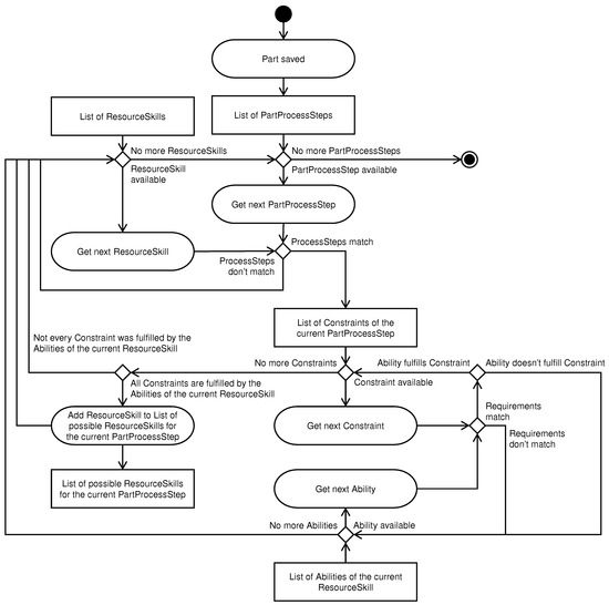 Activity diagram of the solution-finding algorithm taking into consideration Resource Skills, Part Process Steps, and Constraints.
