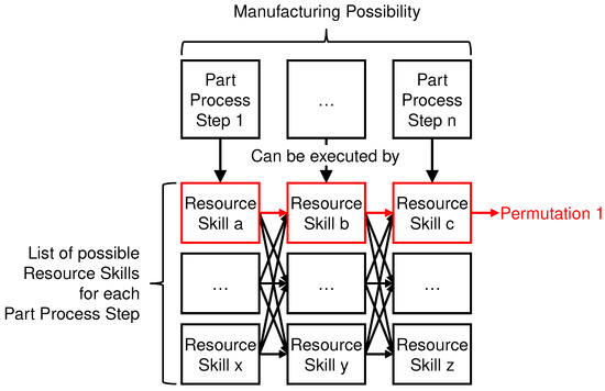 Once it is determined, which part process step can be executed by which resource skill, all possible permutations are created. A permutation is a unique combination of resource skills to fulfill all part process steps n of a manufacturing possibility as schematically shown in Figure 4. For every permutation, comparative factors (price, time, and -eq.) are calculated by summing up the expenses of the individual resource skills.