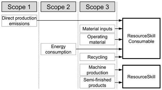 Along the example of energy input, this would mean the right energy source (technology), the appropriate location, e.g., the German grid mix (geographical) and a recent distribution between the technologies (time). For the integration into the framework the relevant data includes direct production emission, operating material, energy consumption, and investments for the machine production as well as material inputs (as production material and semi-finished products). For additive technologies, the material inputs are modeled as production material inputs and for conventional inputs as semi-finished products and thus as a resource. Figure 6 shows the different product flows and its position in the information model. The different product flows are also assigned to the different scopes based on the greenhouse gas emissions protocol [42].
