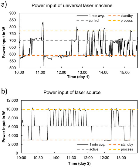 Power demand of (a) the universal laser machine and (b) the beam source during interrupted LMWD process.
