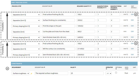 Part Process Step: The part process step contains the required quantity of a process step (e.g., 50 of separation) as well as the specified constraints to create a part. Each part process step belongs to a manufacturing possibility. Multiple possibilities to manufacture the part can be defined.