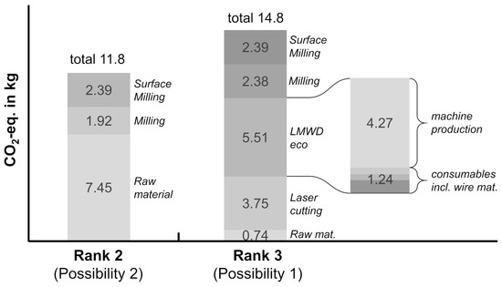The LMWD as a generative process requires a solid base to adhere the first weld beads to. Two different scenarios are possible. It can be used to manufacture a blank similar to a casting process. In this case, a sacrificial building plate is used during the LMWD process to build up the material. This building plate is removed in a subsequent process and then reused or recycled. A continuously reused base does not contribute to the environmental impact of the process. Its costs can be neglected over a sufficiently long lifetime. However, for the considered LMWD system the building plate is a recycling product. Every building plate is laser cut from sheet metal and its material is recycled after sawing it from the blank. In such an application, every mm of building plate contributes with 2.59 × 10−5 kg -eq. to the environmental impact and with 2.55 × 10−4 EUR to the costs of the LMWD process. This can be mapped by adding a building plate consumable to the LMWD resource. In a different scenario, LMWD could be used to add a geometrical feature to a pre-existing semi-finished part. No separate building plate would be required in this case.