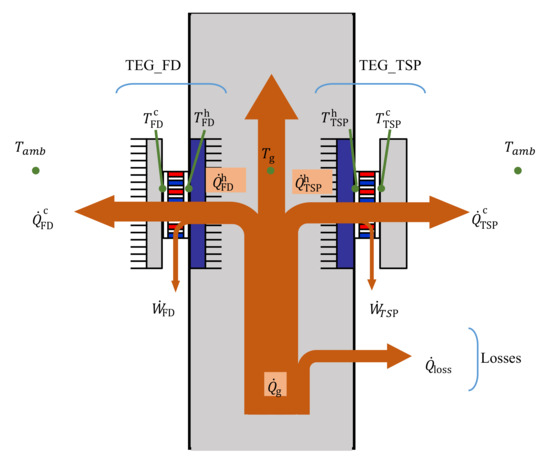 According to Figure 1 the hot gases suffer a temperature drop as they flow inside the duct where the thermoelectric generators are placed. This enthalpy drop can be estimated using Equation (1) and part of the energy is absorbed by the TEG and the rest is released to the ambient as a heat loss through the wall, see Equation (2).