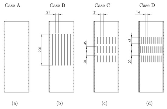 Figure 2 shows the different geometries studied with the computational model. Case A represents a basic inner pipe with flat surfaces and no elements that could enhance heat transfer between the hot gases and the thermoelectric modules. Case B includes long fins longitudinally placed inside the duct which are 35 heigh and are 21 spaced. The objective of these flat plates is to increase the turbulence of the gases flow and to extend the heat transfer area. With the aim of rising the turbulence, even more, short fins have been also studied in two configurations: aligned, Case C; and misaligned, Case D. In this latter case, the exchange area is equal to the surface offered by Case B, so this design will be useful to analyse the influence of the turbulence increase for the same exchange surface.