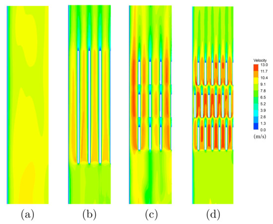 Velocity diagram at a vertical cut section inside the duct after the simulations with a gases temperature of 490 and a mass flow of 100 /. (a) Flat inner surface; (b) Long fins; (c) Short aligned fins; and (d) Short misaligned fins.