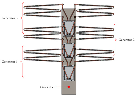 In this way, as it can be seen in Figure 8 and as it happens with the finned heat sink, this design allows the installation of multiple thermoelectric generators in the same exhaust duct. The condensers can be slightly separated from the duct to enable the evaporator of the following generator.
