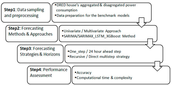 The procedure outlined in this paper, as presented in Figure 2, is structured into four main steps. The first step presents the dataset and tools we have applied for its preprocessing. The second step aims to explore forecasting approaches while using three different forecasting techniques. The forecasting horizons and strategies are developed in the third step. The last step addresses the performance evaluation by two key elements, precision or accuracy and computational time/complexity.
