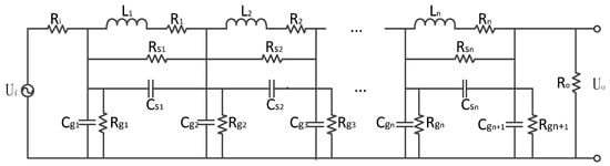 When the transformer winding is excited by a high-frequency voltage signal with a frequency greater than , the permeability of the inner core of the transformer is almost the same as that of the air medium, and the role of the core can be ignored at this time. Therefore, the entire winding of the transformer can be seen as a distributed parameter network composed of resistance, inductance and capacitance [31,32]. Figure 2 shows the equivalent circuit diagram of the n-level distributed parameter network studied in this paper. In Figure 2, and represent winding inductance and resistance respectively, , and represent intercake or interturn capacitance and conductance, respectively, and represent earth capacitance and conductance of winding, respectively. The physical structure and insulation materials of the transformer determine the parameters in the equivalent circuit. When the transformer winding is deformed or short-circuited, the value of will change, such that the transfer function will also change.