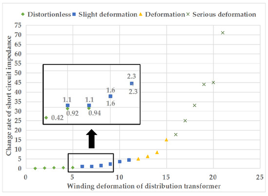 In view of the above deformation, the law between the change rate of transformer short-circuit impedance and the degree of deformation is obtained, as shown in Figure 4.