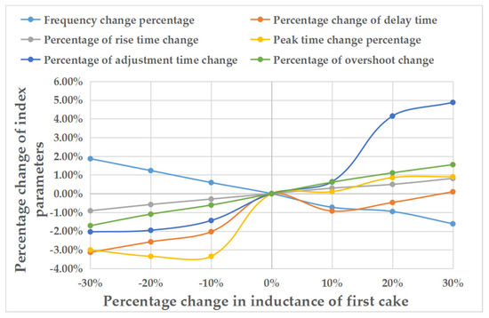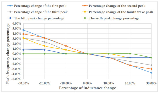 The influence data of the change of the first cake inductance of the transformer winding from −30% to 30% on the frequency response results of the transformer are extracted and processed, as shown in Figure 6.