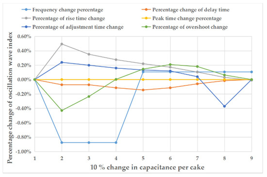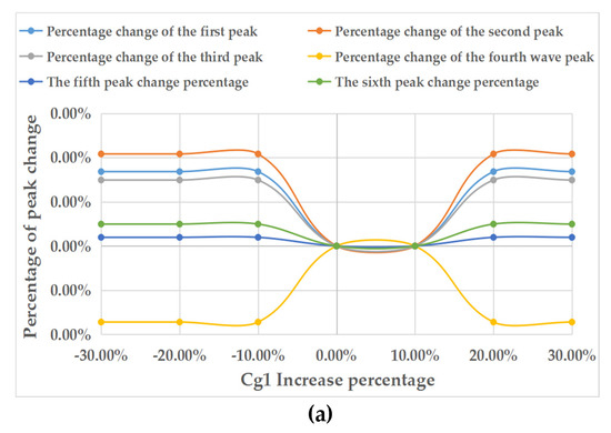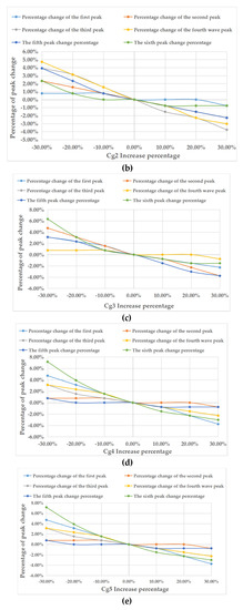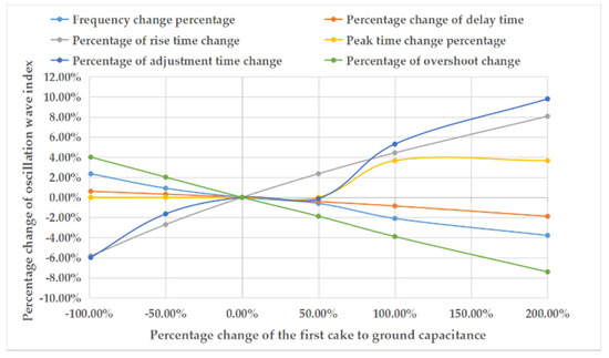 The ground capacitance values of the first to seventh turns are changed from −30% to 30%, and the influence of the ground capacitance changes on the transformer peak changes is obtained, as shown in Figure 7: