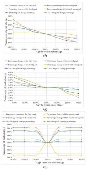 Influence of ground capacitance change on transformer peak frequency change: (a) The influence of Cg1 change on the change of wave peak frequency; (b) The influence of Cg2 change on the change of wave peak frequency; (c) The influence of Cg3 change on the change of wave peak frequency; (d) The influence of Cg4 change on the change of wave peak frequency; (e) The influence of Cg5 change on the change of wave peak frequency; (f) The influence of Cg6 change on the change of wave peak frequency; (g) The influence of Cg7 change on the change of wave peak frequency; (h) The influence of Cg8 change on the change of wave peak frequency.
