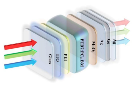 - Chen, C.-C.; Dou, L.; Zhu, R.; Chung, C.-H.; Song, T.-B.; Zheng, Y.B.; Hawks, S.; Li, G.; Weiss, P.S.; Yang, Y. Visibly transparent polymer solar cells produced by solution processing. ACS Nano 2012, 6, 7185–7190. [Google Scholar] [CrossRef]