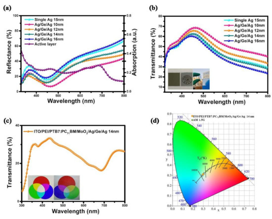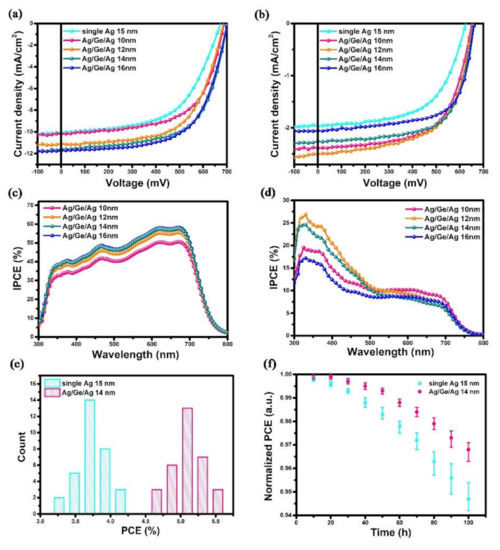 - Liu, S.; Liu, W.; Yu, J.; Zhang, W.; Zhang, L.; Wen, X.; Yin, Y.; Xie, W. Silver/germanium/silver: An effective transparent electrode for flexible organic light-emitting devices. J. Mater. Chem. C 2014, 2, 835–840. [Google Scholar] [CrossRef]