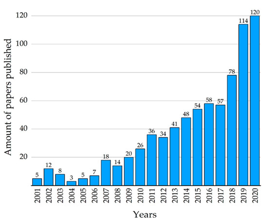 From 2001 to 2020, a total of 759 articles were published. The number of publications about artificial neural networks in the oil and gas industry has increased significantly, especially after 2010. This research trend [12] may be partly due to the breakthrough of deep learning methods in 2010–2012, and researchers beginning to repopulate artificial intelligence. The annual publication volume of ANNs in the oil and gas field is shown in Figure 1.
