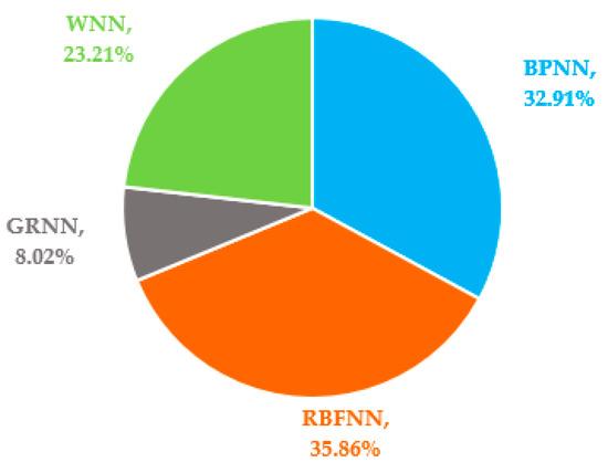 From 2001 to 2020, the percentages of the 4 types of ANNs in the oil and gas industry indicate that RBFNN is used most frequently, accounting for 35.86% of papers, followed by BPNN and WNN, and GRNN is the least frequently used, accounting for only 8.02%. However, since 2010, the volume of publications of the four types of ANNs in the oil and gas industry has shown an increasing trend, among which WNN, BPNN and RBFNN [13] have increased significantly. From 2001 to 2020, the number of publications of 4 ANNs in the oil and gas field is shown in Figure 3.
