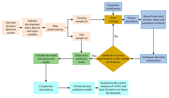 Combined with the actual development process of the oilfield, this paper uses four kinds of ANNs and intelligent algorithms to optimize the ANNs and to predict the research block diagram of the oilfield development index [14], as shown in Figure 4.