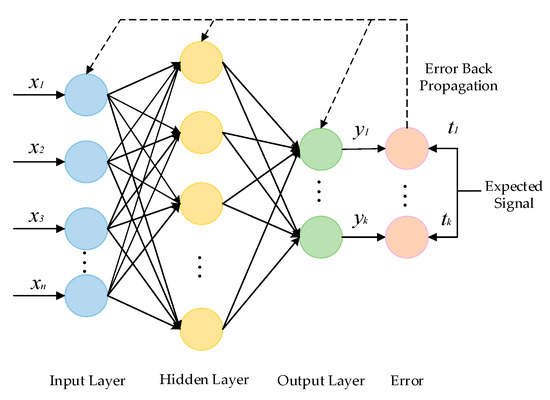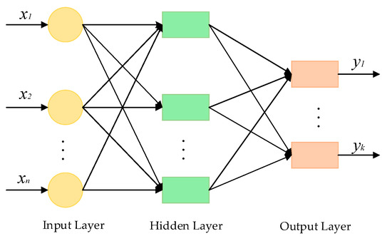 In 1986, Rumelhart and McClelland first proposed the BP Neural Network (BPNN) [15,16,17], which is a multilayer feedforward neural network based on error back propagation. The BPNN is widely used to deal with nonlinear problems [18,19] due to the characteristics of self-adaptation and self-learning. The BPNN can be divided in two ways: signal forward propagation and error backward propagation. When the signal propagates in the forward direction, the signal propagates from the output layer to the output layer; when the error propagates backward, the error propagates back to each layer. The structure of BPNN is divided into three layers: input layer, hidden layer and output layer, which is shown in Figure 5. The number of hidden layer nodes is a very important parameter, and its setting has a great impact on the performance of BPNN [20] The determination of the number of hidden layer nodes is still one of the most difficult problems for BPNN [21]. At present there is no good solution, and the optimal number can only be determined by experimental methods.