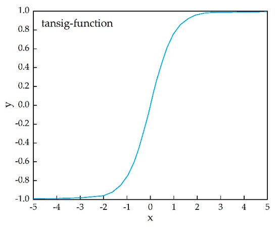 The BPNN hidden layer function is one that runs on the neurons of the artificial neural network and is responsible for mapping the input of the hidden layer to the output. The hidden layer function introduces nonlinear factors into the neural network, so that BPNN can approximate any nonlinear function and apply it to more nonlinear models. The BPNN output layer commonly used linear functions; the commonly used functions of the hidden layer are the logsig function and the tansig function, the expressions of which are shown in Equations (1) and (2), respectively [22].