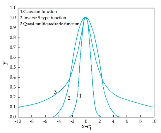 The Gaussian function, Inverse S-type function and quasi-multi-quadratic function are respectively shown in Figure 9. If the width δi of the radial basis function is smaller, the basis function is more selective.