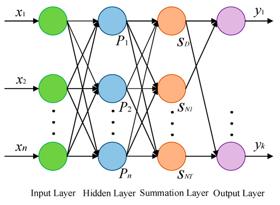In 1991, Donald proposed the Generalized Regression Neural Network (GRNN) [41], which is an improved form of RBFNN and is based on regression mathematical statistics. GRNN has strong non-linear mapping ability and learning speed, and has stronger advantages than RBFNN. It is the final convergence of the network to an optimized regression with a large number of samples. When the sample data is small, the prediction effect is better. In addition, unstable data can also be handled. The network structure of GRNN is four layers, which adds a summation layer to the network structure of RNFNN. It’s network structure is shown in Figure 10.