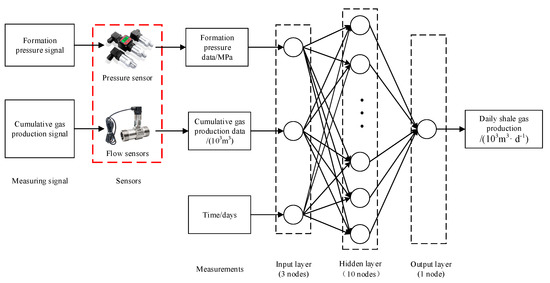 This experimental model takes formation pressure, cumulative gas production and time as input variables [57], and shale gas daily output as the output prediction model. The pressure sensor is needed to measure the formation pressure signal, which converts the formation pressure signal into the formation pressure value, and takes the formation pressure data as the input variable of the model [58,59,60,61]. Similarly, the measured cumulative gas production signal needs a flow sensor, which converts the cumulative gas production signal into the cumulative gas production value and takes the cumulative gas production data as the input variable of the model [62,63,64,65,66].