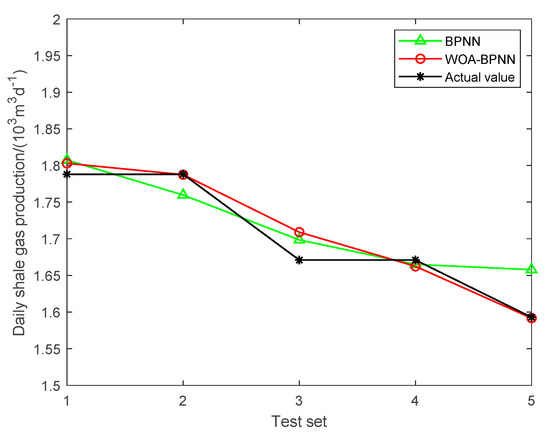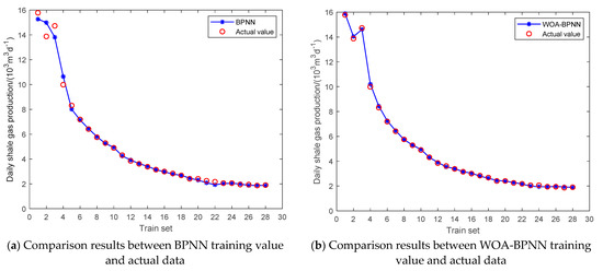 According to the single-well production data of Haynesville in the United States [28], this paper uses Matlab software, adopts a three-layer network structure of BPNN, and uses the Whale Optimization Algorithm (WOA) to optimize BPNN’s inter-layer weights and intra-layer thresholds (WOA-BPNN) in order to establish a decline model for predicting daily shale gas production.
