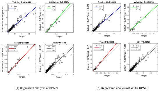 Using Matlab software for calculation, the comparative results of conventional BPNN and WOA-BPNN training value and actual data are shown in Figure 14a,b (28 training data). Figure 15 shows the comparison result of the actual value, BPNN predicted value and WOA-BPNN predicted value (5 predicted-data). Figure 16a is the comparison result of the relative error between the BPNN training value and the WOA-BPNN training value. Figure 16b shows the comparison of the relative error between the predicted value of BPNN and the predicted value of WOA-BPNN. Figure 17a,b are the comparison results of the correlation between BPNN and WOA-BPNN training set, prediction set and actual value, respectively.