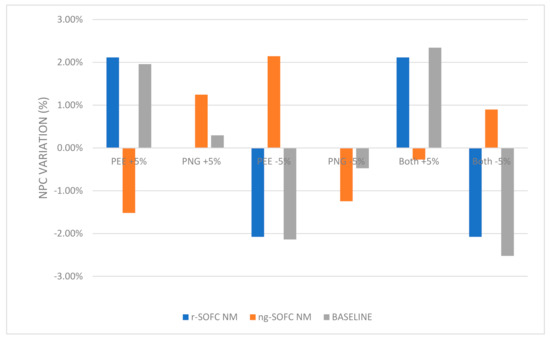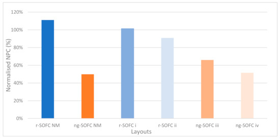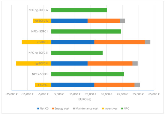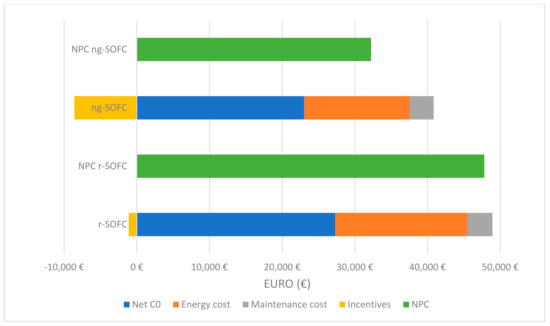 The results show that economic performance of the operational phase, i.e., without capital cost, obtains savings for the ng-SOFC, compared to the base case, in all the configurations.