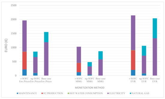 With respect to externalities, we analyse variations of annual savings by the introduction of a tax (equal to the environmental impact) on the price of the systems aimed at driving the market towards green solutions. The monetization of externalities by means of three different methods shows that the environmental cost of the ng-SOFC system is the lowest among the alternatives, followed by the base case and at last, the r-SOFC system. This leads to an increase of the annual savings of the ng-SOFC system by about 50% each year. The ng-SOFC system would be incentivized by the internalization of environmental costs into direct costs. The r-SOFC system in this case results in higher environmental costs than the base case.