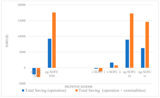 When externalities are not considered (blue bars), the r-SOFC system results in negative total saving in the NM scenario and in the configuration i of SG incentive (i.e., there are not savings compared to the base case) while in configuration ii of SG incentive the total saving is 1685 EUR.