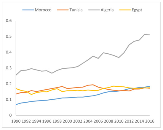 Researchers have focused more on examining gross term energy use and CO2 emissions in the existing literature while ignoring the gap between the residential sector and other production sectors [9]. Therefore, the current study is an attempt to empirically examine the residential CO2 emissions, urbanization, GDP, and REC nexus in the North Africa region. Using annual data from 1990 to 2016, the study’s goal is presented under the assumption that (i) REC boosts residential pollutant emissions in the North Africa region, (ii) high incomes are the main generator for pollutant emissions in the North Africa region, and (iii) a dynamic and causal nexus exists between REC, urbanization, income, and RCO2 emissions in the North Africa region. By primarily addressing the influence of urbanization and wealth on environmental pollution in the North Africa region, this study is intended to fill the gaps in the previous studies of Poumanyvong et al. (2012) [10] and Boukhelkhal et al. (2018) [11]. This study differs from the earlier studies in that it employs distinct regression models for each country based on their unique features. While Algeria and Egypt are energy producers and exporters, Morocco and Tunisia are highly dependent on energy imports (93% for Morocco; 48% for Tunisia in 2018) [1]. With panel regression models, such features are hard to capture. Furthermore, the research sought to determine whether there was an EKC association between environmental pollution and economic development, as several prior studies had failed to do so. Finally, a rigorous interpretation can be yielded from the integrated use of the econometric techniques such as the autoregressive distributed lag (ARDL) bounds testing approach to cointegration, ARDL short and long-run estimations, and the Toda–Yamamoto Granger causality testing [12].