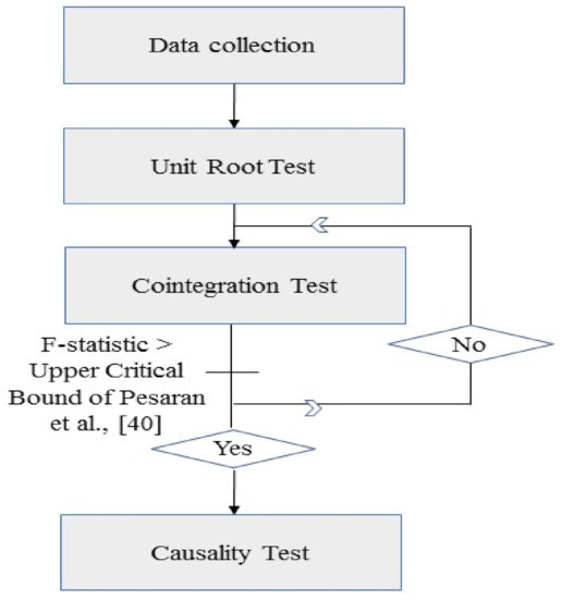 where are the parameters of the model to be determined, with k = 0… 4, and is the error term. The procedure followed for achieving the goal of the study is shown in more detail in Figure 2. After collecting data, we first verified the stationarity of the variables since most economic, energy, and demographic variables are non-stationary, and Granger and Newbold [42] suggested that a non-stationary time series might lead to a misleading conclusion. Second, we used an ARDL bounds cointegration test to determine whether there is a long-run relationship among the series under study. An ARDL bounds cointegration test consists of many steps: determining the optimal Lag; checking the presence of cointegration using an F-statistics test; estimating long and short-run results; and ensuring that the model is stable. Upon the validation of cointegration between the variables, the third step is to establish the direction of the causal link using the Toda–Yamamoto Granger causality test.