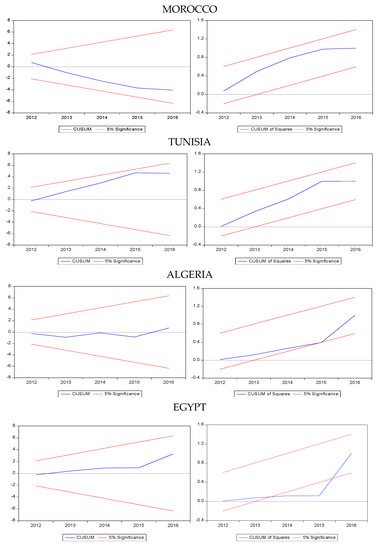 To evaluate the accuracy of all individual ARDL models, four standard diagnostic tests are applied and presented in Table 7. The Lagrange Multiplier (LM) test confirms the absence of serial correlation at the 5% significance level in all models. The JB normality test reveals that all residuals have a normal distribution. The Ramsey RESET test results show that the short model is well specified, except for Egypt. Furthermore, the Autoregressive Conditional Heteroscedasticity (ARCH) test shows that the error terms are free from heteroscedasticity problems in all models. The CUSUM and CUSUMQ graphs developed by Brown et al. [49] are plotted to test the stability of the estimated models. As indicated in Figure 3, the trend of both graphs shows that models are stable as they are lying between upper and lower limits in all countries, except for Egypt. Indeed, Figure 3 shows that the CUSUM plot for Egypt is completely stable within 5% of the critical bands contrary to the CUSUMQ plot, which deviates for a small period; nevertheless, the deviation seems to be transient as the CUSUMQ plot returns completely toward the criteria’s bounds. Therefore, we argue that the estimated ARDL Egypt model is roughly stable. At the same time, we should bear in mind that our findings should be considered with caution.