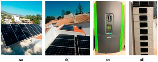 Case study details: (a,b) PV system, (c) inverter, (d) battery system [39].