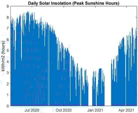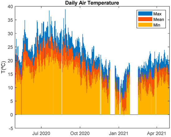 One year of data, from May 2020 to April 2021 was collected, processed, and will be used in this work. The weather information within this period can be seen in Figure 3, Figure 4 and Figure 5. Either due to acquisition problems or sensor faults in a few periods throughout the year, valid data was not simultaneously available for all the variables used in this work. Due to this, data for these periods was deleted, as it can be seen in the subsequent figures, before and after January 2021.