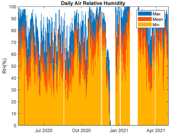 Maximum, mean, and minimum annual air relative humidity.