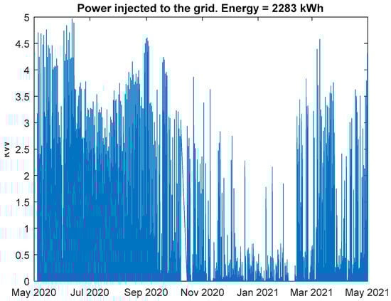 During the yearly period, approximately 10 MWh were consumed in the residence. The following two figures show the power injected into the grid (Figure 7) and bought from the grid (Figure 8). As can be seen, the house is a nearly zero annual energy building but unfortunately, due to the tariffs, that is not translated into economic costs.