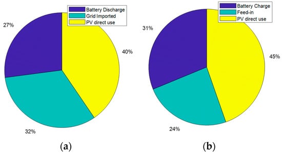 The power balance of the system is given by Equation (1), where PPV is the power produced by the PV system, is the power supplied by the grid, is the battery charging power, is the battery discharging power, PH is the home power consumption, and is the power injected into the grid.